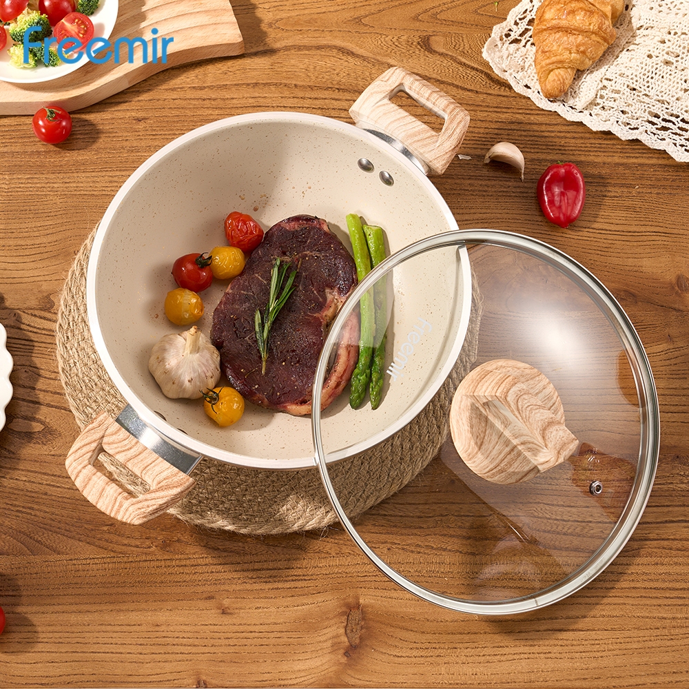 Wajan anti lengket Freemir ini punya ukuran allsize dengan diameter 24cm dan tinggi 7,5cm. Cocok banget buat masak harian di rumah, dari goreng telur sampai tumis sayuran. Terbuat dari bahan granite coating yang kuat, jadi nggak gampang lengket dan gampang dibersihin. Bagian gagangnya juga nyaman dipegang karena ada pola kayunya yang estetik.